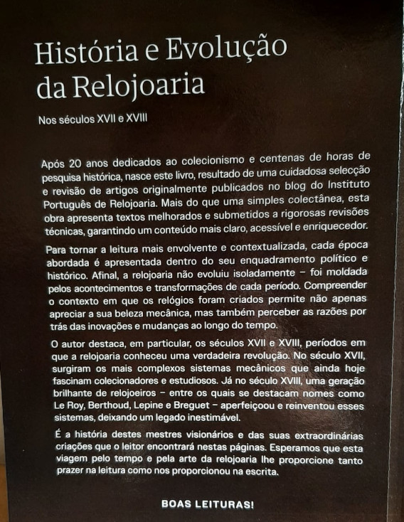 Um livro criado pela paixão do colecionismo, conhecimento e vontade de saber. Uma coletânea de artigos publicados no blog do Instituto de Relojoaria e com adições e revisões dos mesmos para contextualizar e enquadrar a evolução da relojoaria no seu contexto histórico.