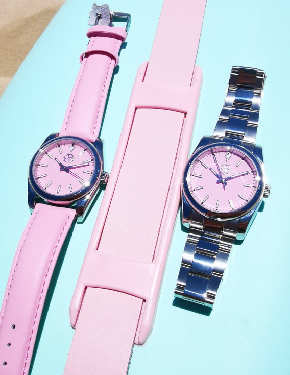 < Pulseira de pele Rosa opcional na versão Pérola Rosa